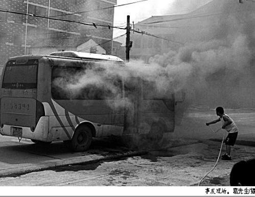失火的中巴車是上塘往返橋下的城鄉(xiāng)中巴車,隸屬于永嘉縣公交公司。在現(xiàn)場(chǎng)可以看到,失火中巴車車頭受損,車窗玻璃破損。