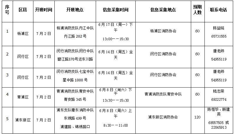 2013年6月建筑物五級消防員培訓(xùn)班將在浦東、楊浦、閘北、閔行等8個區(qū)縣,9個培訓(xùn)點開班,具體信息采集及開班情況見下表(人滿截至):