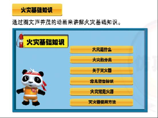 5、教育趣味化(火災(zāi)基礎(chǔ)知識(shí)、逃生常識(shí)部分、滅火仿真體驗(yàn)部分,采用了游戲、動(dòng)畫、口訣、仿真技術(shù)等多種表現(xiàn)形式進(jìn)行交互教學(xué)體驗(yàn),實(shí)現(xiàn)了寓教于樂(lè))。
