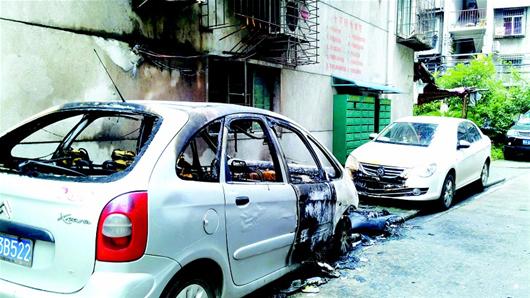 昨日凌晨,武昌雄楚大道曬湖社區天華新村,一輛轎車突然起火。昨日上午,事發現場仍有一股汽油的味道,一輛兩廂轎車已被燒成空殼。該車前方還停著一輛轎車,其車頭部分被燒壞。在天華新村11棟4樓,一名女子正在擦洗被熏黑的窗戶防盜網,整面墻到5樓都有被熏黑的痕跡。