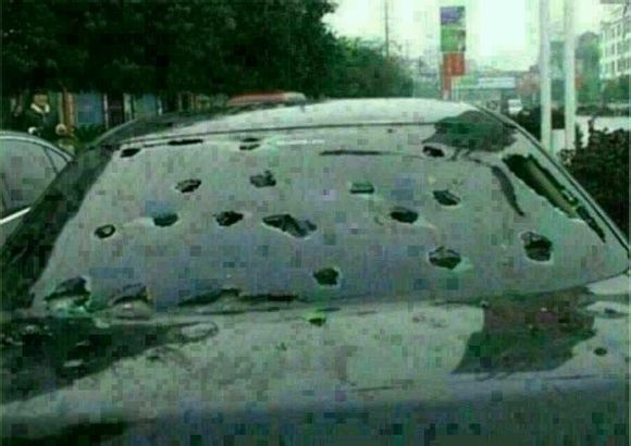 東勝暴雨雞蛋大的冰雹將有些車的擋風玻璃砸成了篩子。城區一些低洼地區積水嚴重,大量車輛被泡在水中。