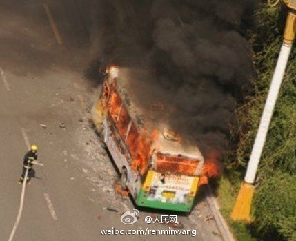 今天中午11時30分許,烏魯木齊一輛528A路公共汽車行駛到光明路段博格達賓館前突然起火燃燒。