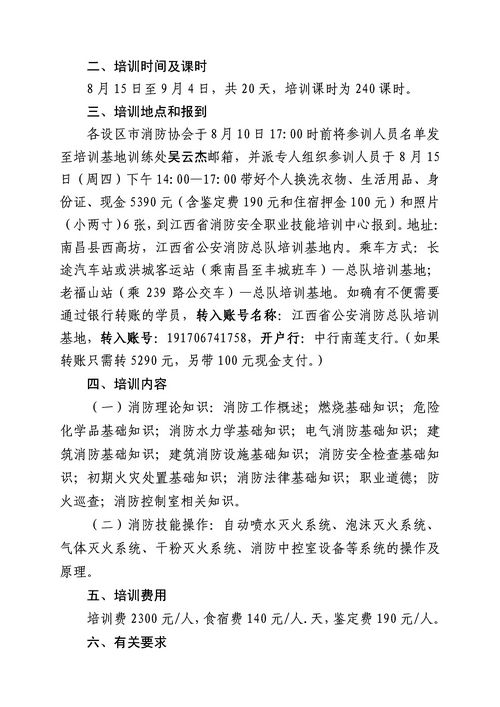 核心提示:江西消防協會關于舉辦2013年度全省第六期建(構)筑物消防員培訓班的通知,培訓時間是8月15號到9月4號,為期20天,共240課時。