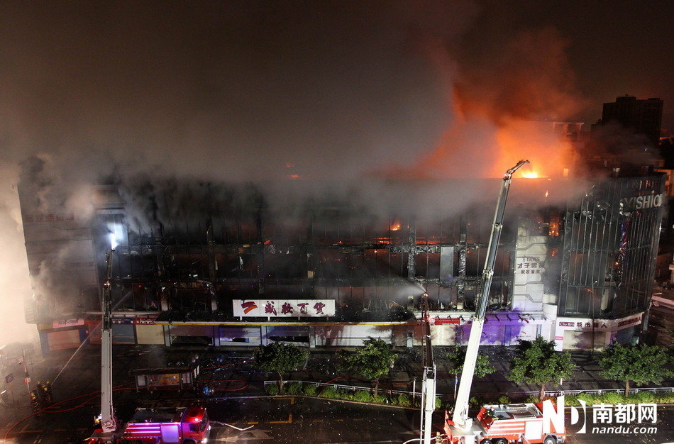 昨日0時左右二樓三樓開始冒出濃煙,但商場外未見明火。消防隊員數次進入商場,均被濃煙逼出。1時58分,商場二樓面向寶石南路方向有明火躥出3米多高,玻璃幕墻碎落,聲勢驚人,隨后大火從二樓中間地帶向兩側蔓延,十余架水龍齊噴也擋不住火勢蔓延。30分鐘后,三樓、四樓密封玻璃幕墻均有破損,相繼有明火出現,火光沖天,對街被大火映照猶如白晝,距離起火點約30多米的地點都可感受到熱浪。