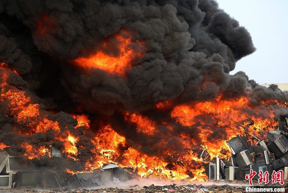 接警后,消防迅速趕往撲救。堆放在露天場(chǎng)地的近萬(wàn)臺(tái)電視機(jī)被大火吞噬,現(xiàn)場(chǎng)不停傳出爆炸的聲音,滾滾黑煙遮天蔽日。