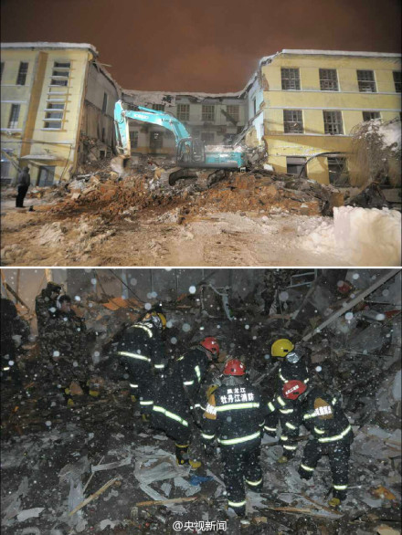 11月25日13時21分,牡丹江市康佳街北側一處三層老廠房在暴雪中發生樓頂坍塌。