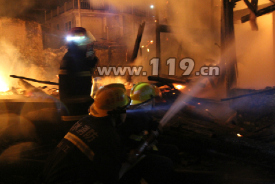 3時18分,消防官兵抵達火災現場,只見火光沖天,熊熊烈火燒穿了房頂,屋內墻壁開始坍塌,整幢民房處于猛烈燃燒階段,現場一片嘈雜混亂。起火的民房是一棟土木結構的老屋,屋內有液化氣罐,劇烈燃燒的老屋正向毗鄰清代祠堂和周邊密集的磚木結構民房蔓延,若不及時對肆虐的大火進行圍剿撲滅,很有可能引燃清代祠堂和周邊民房,造成古建筑的損毀和巨大的經濟損失。