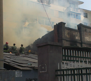 今天早上8點20分左右,通化市中心的市幼兒園北側一片棚戶區發生火災。火勢迅速蔓延,將通化市現存最古老的建筑物佟江書院燒得面目全非。