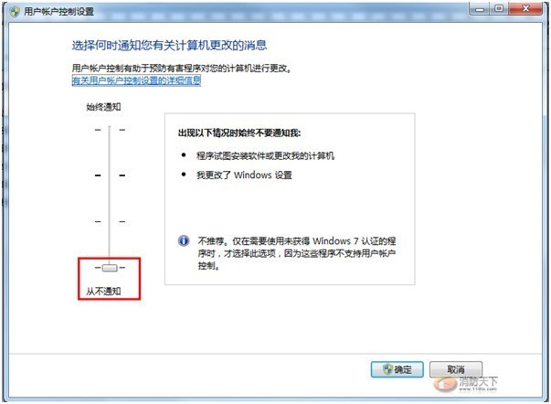 “更改用戶帳戶控制設置”中將通知級別修改為“從不通知”。