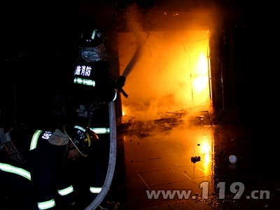 消防官兵趕到事故現場時,只見服裝店內燃著熊熊大火,店內一個煤氣罐正被大火燒烤著,煤氣罐自身也吞吐著火焰。