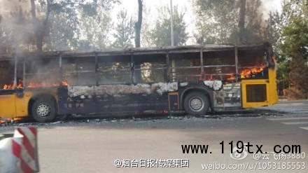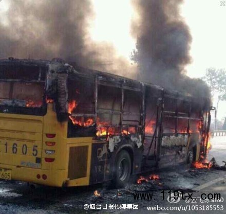 今天早上8點40分左右,山東煙臺龍口1路公交車車牌號魯FK1605起火,疑人為故意縱火。