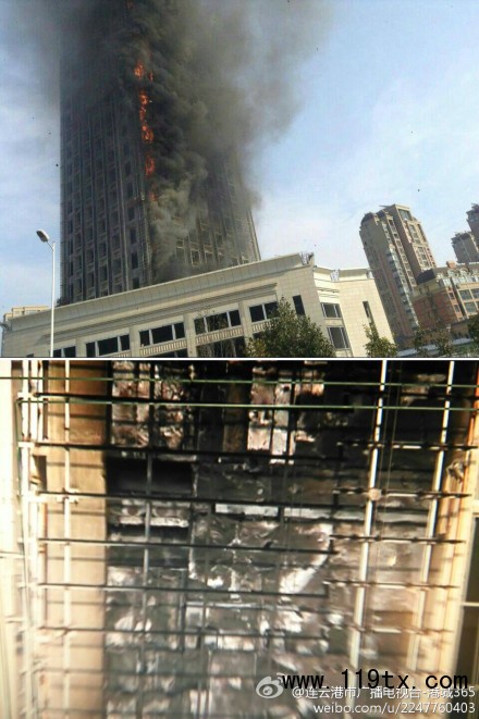 今天上午10點40分左右,連云港郁洲路博威江南明珠苑小區一在建高層樓房外墻就起火。