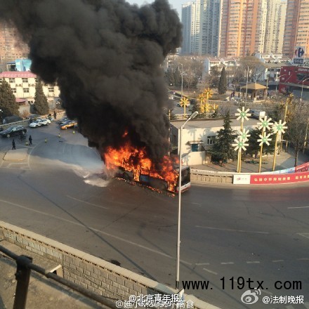 今天上午10點左右,北京豐臺區方莊環島,一輛741公交車起火燃燒。