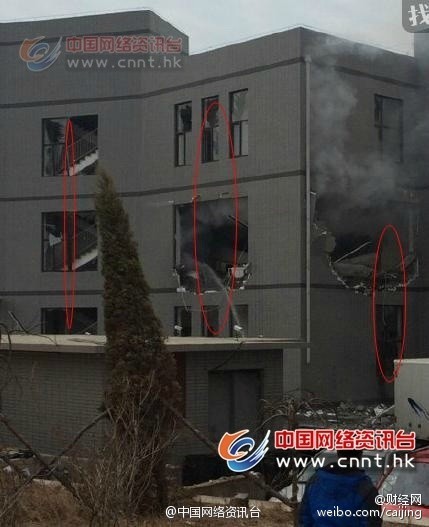 現(xiàn)場(chǎng)未發(fā)現(xiàn)明火,爆炸導(dǎo)致墻體開例,三樓大部分玻璃都被炸碎。