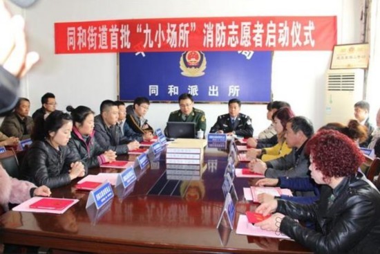 據了解,同和派出所在深入調研的基礎上,在轄區主要街道、繁華區域組建了首批消防志愿者隊伍。他們在300戶沿街商鋪“九小場所”中聘請30名消防志愿者,將300個“九小場所”分為30個小組,消防志愿者作為小組長,協助消防專管民警開展消防宣傳、排查整改隱患和火災撲救等工作。