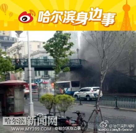 今天上午8點半左右,哈爾濱道里區一61路公交車行駛至哈一百門前天橋下時突然起火。