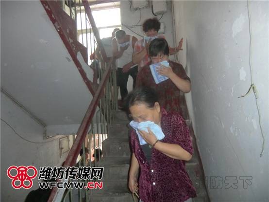 社區工作人員向居民介紹了消防服裝的功能,講解了消防滅火器的使用方法,并帶領大家進行模擬消防演習。假設樓上起火,產生大量煙氣,居民在社區工作人員的帶領和指揮下,用濕毛巾捂住口鼻、貓著腰,手牽手、相互幫助,順著墻壁,緊張有序地疏散離開。