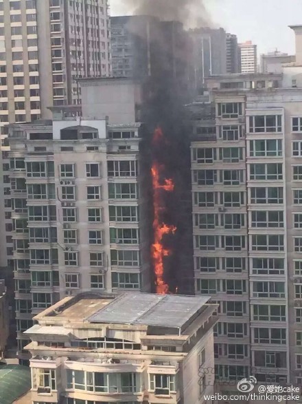 現場火光沖天,沿著外墻不斷往上蔓延,黑煙滾滾。