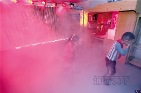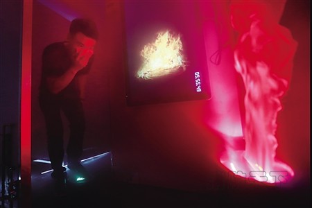 而在家庭和寢室場景里,鄒老師按下火災場景的按鈕后,房間里頓時噴出濃煙,投影儀拍出的火焰效果、風機和紅色綢緞形成的模擬火焰占據了整個房間。
