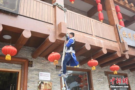 11月9日,在第25個(gè)全國(guó)消防安全宣傳日之際,四川綿陽(yáng)消防支隊(duì)官兵走進(jìn)北川,舉行了2015年“119”消防宣傳周啟動(dòng)儀式,并為當(dāng)?shù)乩习傩昭菔玖巳绾巫跃取⑻由?、防火?zāi)等消防知識(shí)。圖為北川當(dāng)?shù)鼐用裱菥?ldquo;樓層滑繩自救”。 中新社記者 楊勇 攝