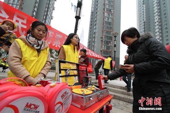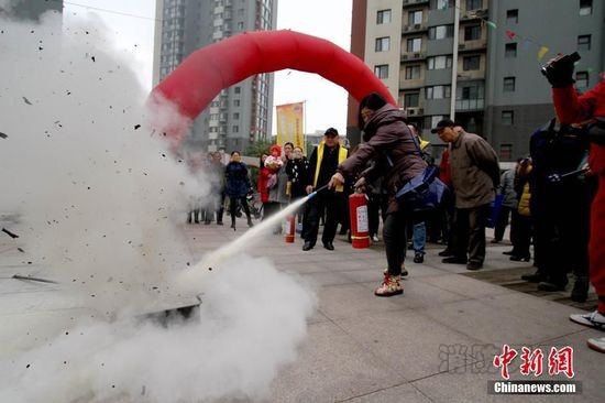 11月9日,天津市濱海新區(qū)舉行“119”消防宣傳日活動(dòng)。濱海新區(qū)首家專業(yè)從事消防職業(yè)技能培訓(xùn)的教育機(jī)構(gòu)——天津市濱海新區(qū)融華消防職業(yè)培訓(xùn)學(xué)校走進(jìn)社區(qū),向市民普及消防安全知識(shí),“消防教師”現(xiàn)場(chǎng)進(jìn)行消防安全教育,以提高全社會(huì)的消防安全意識(shí)和應(yīng)急避險(xiǎn)、逃生自救能力。圖為一位市民在“消防教師”的指導(dǎo)下進(jìn)行滅火器操作。