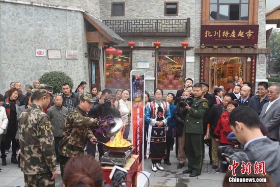 11月9日,在第25個(gè)全國(guó)消防安全宣傳日之際,四川綿陽(yáng)消防支隊(duì)官兵走進(jìn)北川,舉行了2015年“119”消防宣傳周啟動(dòng)儀式,并為當(dāng)?shù)乩习傩昭菔玖巳绾巫跃?、逃生、防火?zāi)等消防知識(shí)。圖為消防人員示范“油鍋火災(zāi)撲救”。 中新社記者 楊勇 攝