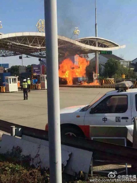 今天中午11點半左右,無錫錫宜高速出口收費站一大卡車起火。