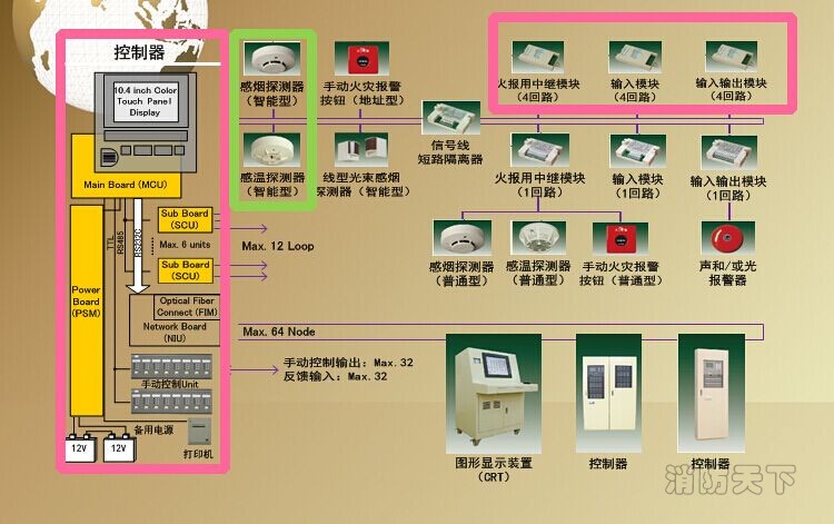 當(dāng)傳輸信號(hào)中斷時(shí),信號(hào)傳輸基板SCU上具有的CPU處理器仍然能檢測(cè)到由端末設(shè)備發(fā)來的火災(zāi)信息,并對(duì)系統(tǒng)連接的聲光報(bào)警器等現(xiàn)場(chǎng)警報(bào)設(shè)備進(jìn)行聯(lián)動(dòng)控制,該項(xiàng)引進(jìn)消化日本專利技術(shù)。