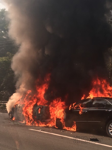 現場濃煙滾滾,火勢迅猛,兩車很快被大火包圍。