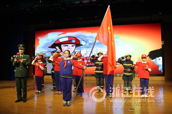 “少年消防志愿隊(duì)成立儀式”正式開(kāi)始。所有少先隊(duì)員簽署了服務(wù)G20協(xié)議。消防員們?yōu)橹驹刚叽韨兇泶魃洗碇驹傅男〖t帽,杭州市公安消防支隊(duì)濱江區(qū)大隊(duì)黨委書(shū)記、教導(dǎo)員唐繼文為校大隊(duì)部組織委員湯珂授旗。白馬湖人又擁有了一個(gè)光榮的名字——濱江區(qū)少年消防志愿者杭州二中白馬湖一大隊(duì)。
