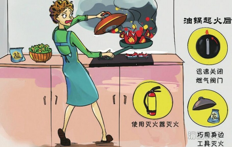 鍋蓋:當鍋里的食油因溫度過高著火時,關閉燃氣閥門后迅速蓋上鍋蓋,使火熄滅。如果沒有鍋蓋,手邊其他東西如洗菜盆等只要能起覆蓋作用的都行。