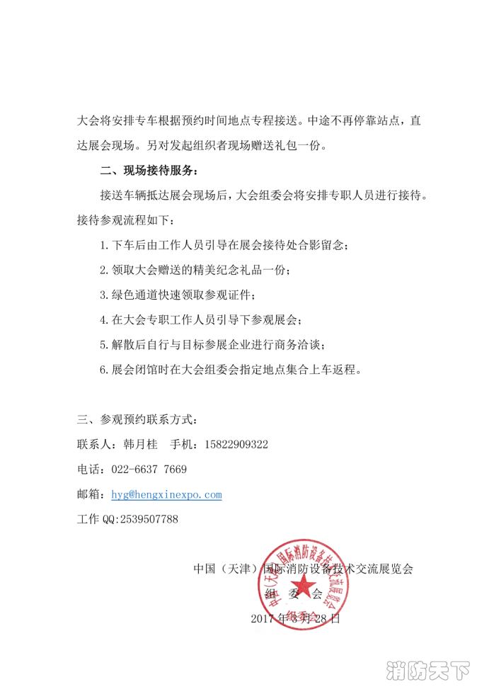 為積極配合國家京津冀協同發展戰略,加快我國平安建設,推動消防產業發展、科技創新及國際合作,由國內外消防界協會組織與天津恒信展覽有限公司聯合舉辦的“第八屆天津國際消防設備技術交流展覽會(Chinafireexpo2017)”將于2017年5月8-10日在天津國際展覽中心(天津市河西區友誼路32號)召開。