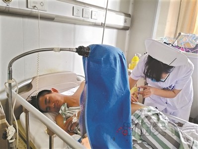 “在醫(yī)院檢查后,我才了解到手指傷情很嚴(yán)重,幾乎只有一點皮連著,里面骨頭和肌肉都被壓斷了。”李志江說。在廣東省第二人民醫(yī)院住院3號樓10樓創(chuàng)傷骨科,躺在病床上的李志江因剛動過手術(shù)不久顯得有些疲倦,右手掌用藥紗布包纏著,受傷的右手食指還有血跡,醫(yī)務(wù)人員正在給他注射藥劑,他的同事和家人都在陪護著他。
