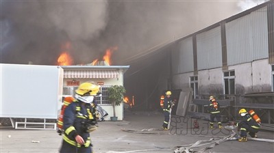 經(jīng)火情偵察了解得知,起火建筑為單層鋼混結(jié)構(gòu)倉庫,總面積約1000平方米,過火面積約為200平方米,燃燒物為泡沫和紙皮等。現(xiàn)場火焰飛竄,濃煙滾滾。