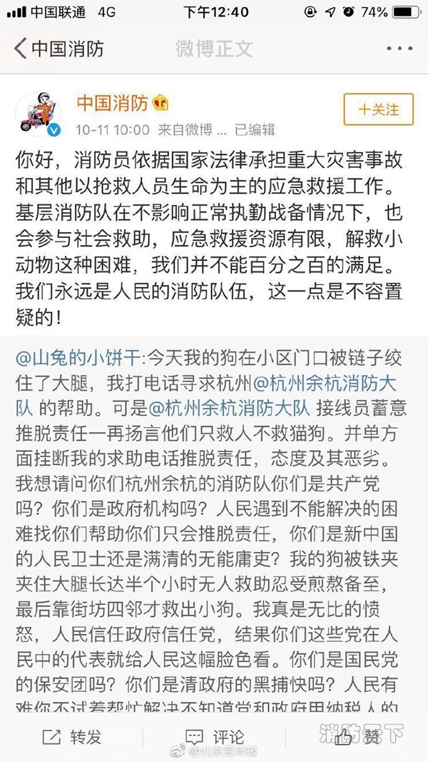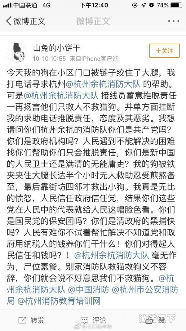 @北京青年報 官方微博10月11日消息,10月10日晚,一網友在微博發帖稱,自家養的狗被鏈子絞住大腿,向杭州余杭消防大隊求助,希望得到幫助。接線員多次聲明“只救人不救貓狗”,并掛斷電話,引發該網友不滿,質疑當地消防無作為。