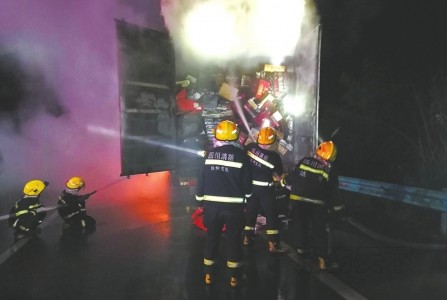消防人員奮力撲救著火的快遞車。