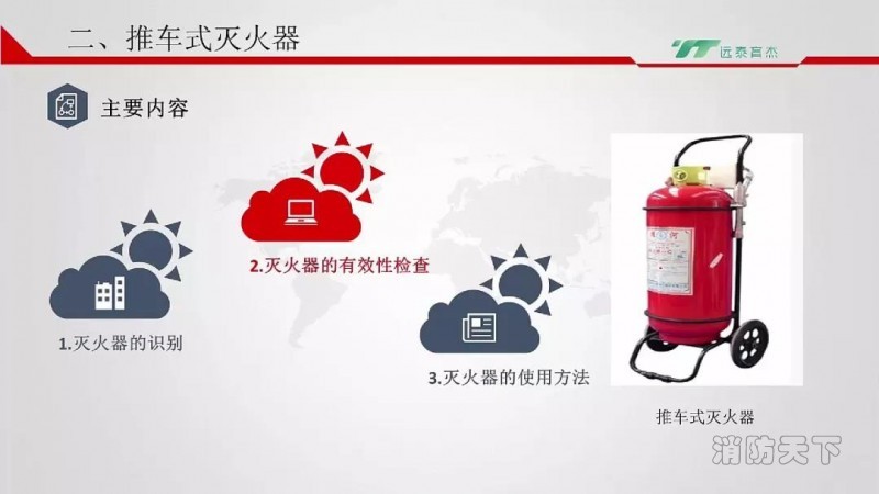 推車式的知識點也是三個部分,分別為:滅火器的識別、有效檢查、使用方法。