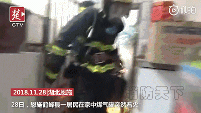 恩施一居民在家中陽臺上用煤氣噴槍燒肉時,不慎將煤氣罐引燃,噴出一米多的火舌。危急時刻,消防員在隊友的水槍掩護下,徒手將“定時炸彈”從屋內拎出,移至空曠地帶,對煤氣罐進行冷卻并稀釋泄漏的煤氣,成功化解險情。致敬“抱火哥”!