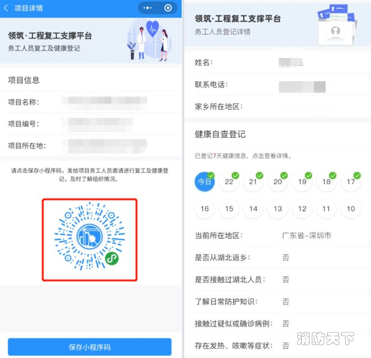 此外,項目管理人員可以把務工人員拉上“復工幫”小程序,利用其中的“每日健康打卡”等功能做好健康監控,幫助項目及時了解,加強項目疫情防控。