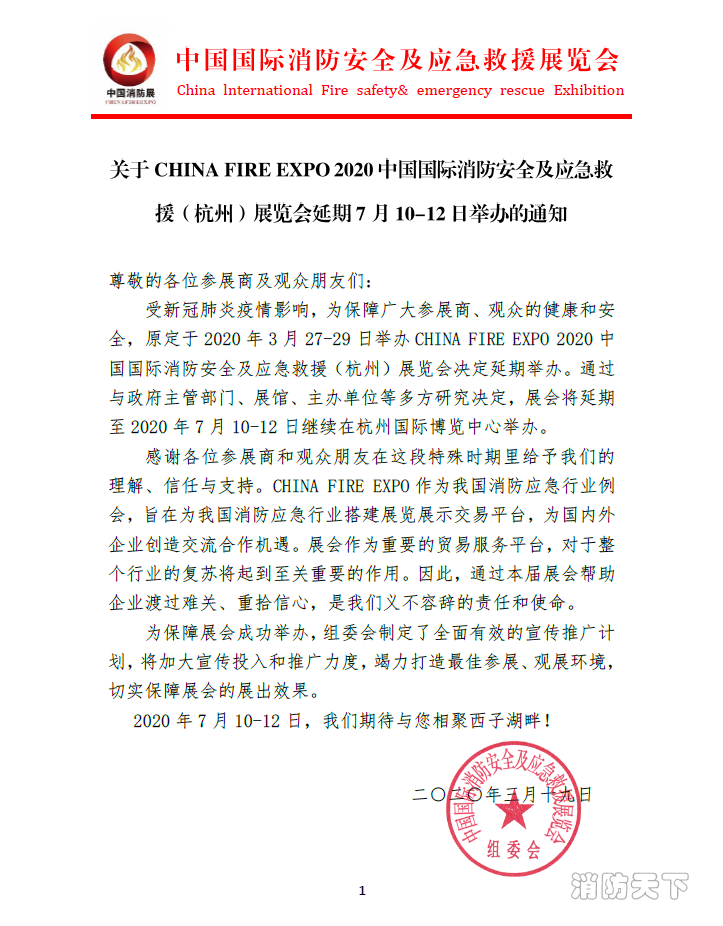 通知:CHINA FIRE EXPO 2020杭州消防展將于7月10-12日舉辦