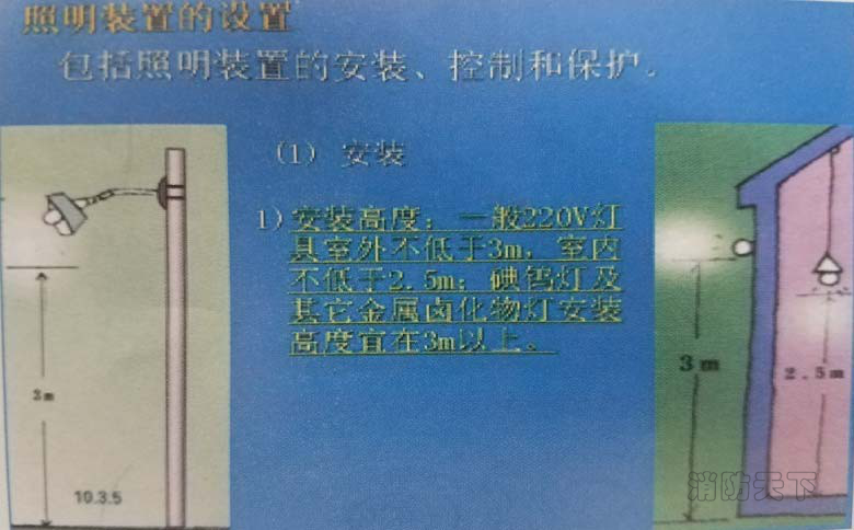 • 室外 220V 燈具距離地面不得低于 3m,室內(nèi) 220V 燈具距離地面不得低于 2.5m。