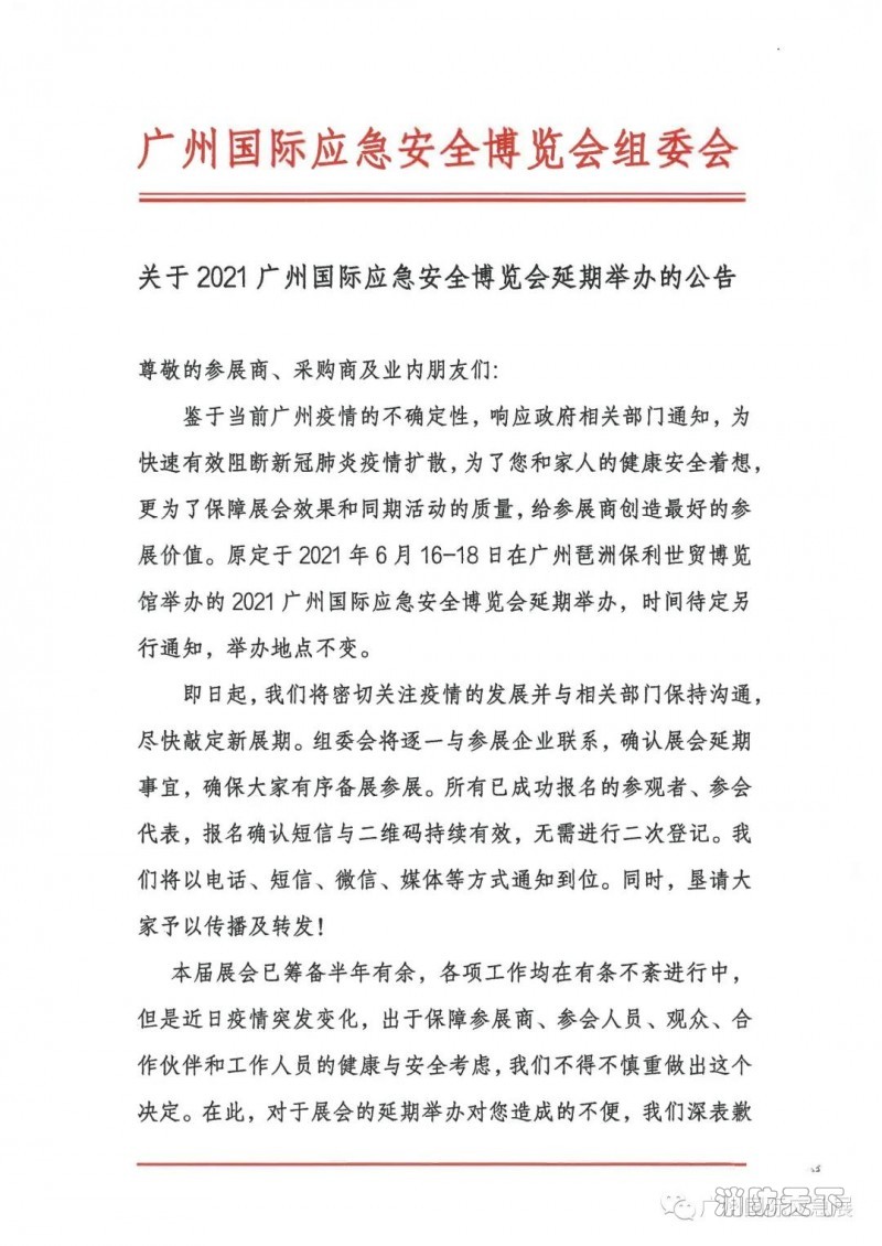 鑒于當前廣州疫情的不確定性,響應政府相關部門通知,為快速有效阻斷新冠肺炎疫情擴散,為了您和家人的健康安全著想,更為了保障展會效果和同期活動的質量,給參展商創造最好的參展價值,原定于2021年6月16-18日在廣州琶洲保利世貿博覽館舉辦的2021廣州國際應急安全博覽會延期舉辦,時間待定另行通知,舉辦地點不變。