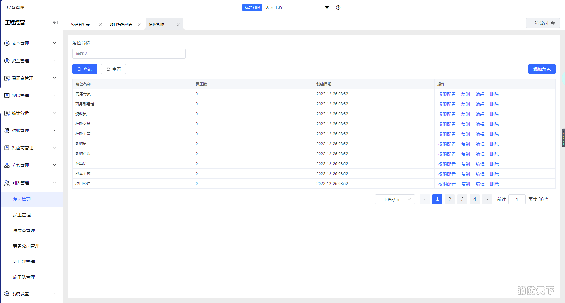 流程線上化后,企業便可進行更多維度的經營管理,例如通過領筑云經營管理模塊內的團隊管理功能,可以對與業務相關的角色,例如企業員工、供應商、勞務公司、項目部、施工隊進行權限配置和角色增減等組織管理工作,降低業務角色混亂導致的潛在風險,促進企業經營管理合規。