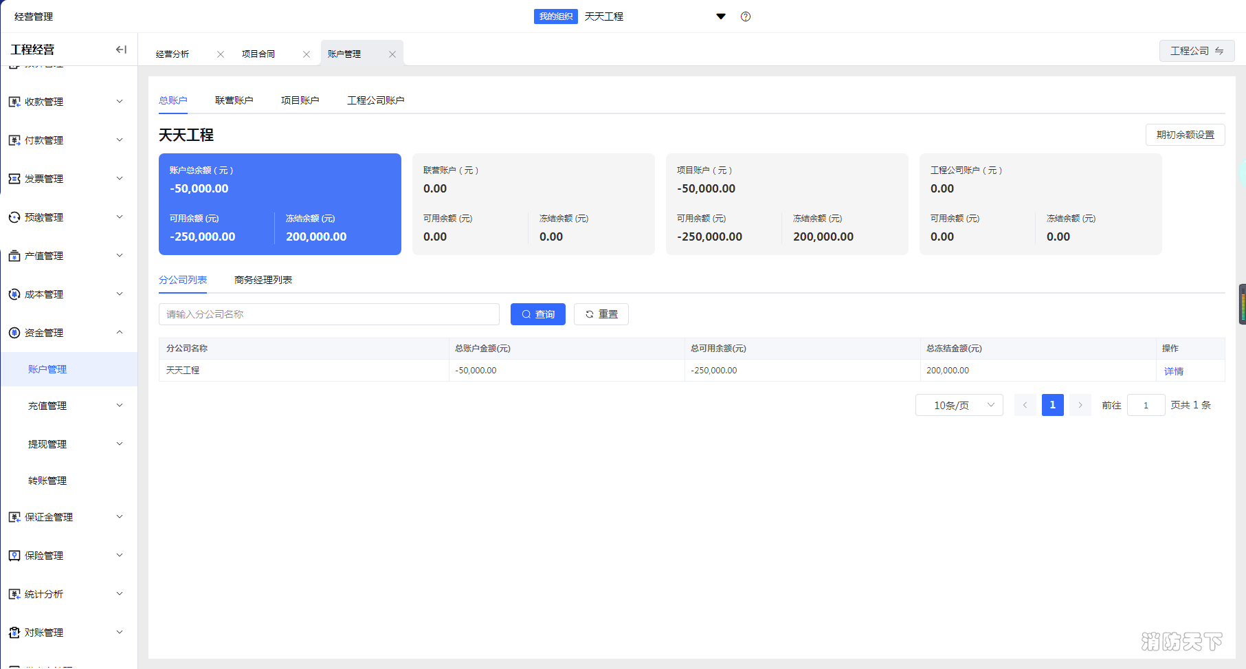 當然,如果你是建企的管理者,并不需要操作這些資料文件,只想了解企業賬戶的具體資金情況,那么你只需要登陸領筑云,找到經營管理模塊中的資金管理功能,在其中賬戶管理頁面便能了解到企業賬戶余額、可用余額、凍結余額、賬戶余額等資金情況,便于管理者及時協調收入支出比,避免企業出現嚴重的資金失調風險。