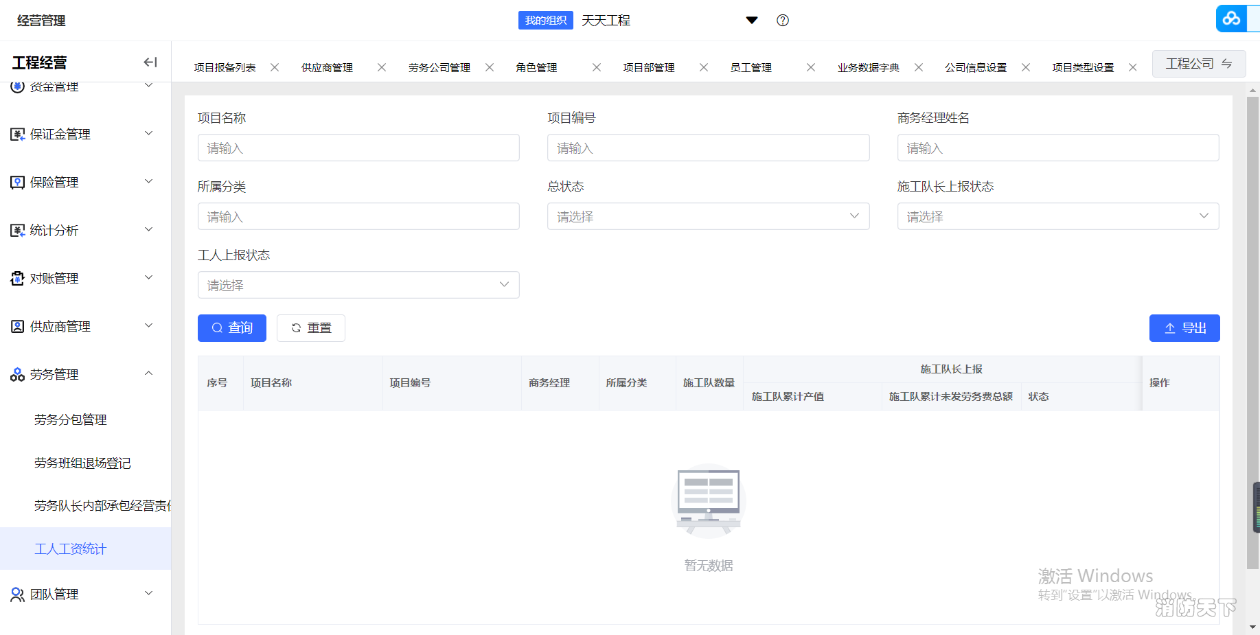 針對目前行業監管十分嚴的農民工工資發放問題,建企也能通過勞務管理功能,實時查看勞務分包、勞務班組、勞務承包、工人工資統計等情況,一旦發現可能出現的勞務風險,建企便能快速響應,積極去處理風險,減少勞務糾紛事件的發生。