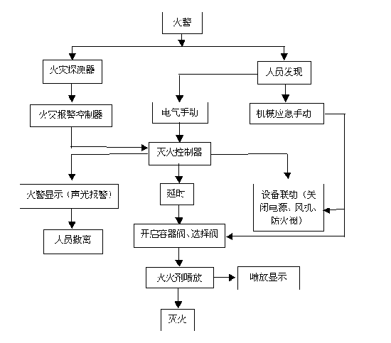 在保護區無人時,將滅火控制箱內控制方式轉換開關撥到“自動”位置,滅火系統處于自動控制狀態。當保護區發生火情,火災探測器發出火災信號,報警器即發出聲光報警信號,同時發出聯動指令,關閉聯動設備,經過約30秒延遲時間(此時保護區內的人員必須全部撤離),發出滅火指令,電磁啟動閥動作打開儲存瓶容器閥,釋放出滅火劑進行滅火。