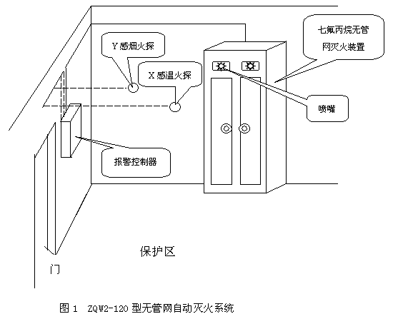七氟丙烷無管網自動滅火裝系統由火災探測器、自動報警控制器、滅火控制器、固定滅火裝置、滅火劑、輸送軟管道和噴嘴組成。