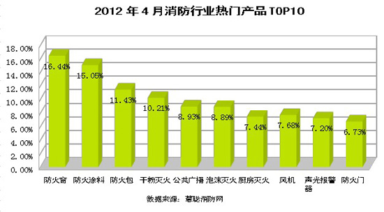 消防天下消防市場監測數據顯示2012年4月份消防行業熱門產品關注度排名依次是:防火窗、防火涂料、防火包、干粉滅火、公共廣播、泡沫滅火、廚房滅火、風機、聲光報警器、防火門。