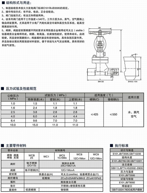 適用于工作溫度≤425℃和≤550℃,工作介質為水、蒸汽或空氣的管路上,作為啟閉裝置;