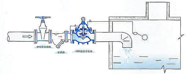 100X遙控浮球閥利用管道上游的水壓推動(dòng)閥瓣上升,開啟閥門,向水池供水;當(dāng)水池液面到達(dá)所需高度時(shí),浮球在浮力的作用下上升,從而關(guān)閉閥門,截?cái)喙艿老蛩氐呐欧?。?dāng)水池排放掉水時(shí),浮球下落,開通上腔的流通,此時(shí),上游的壓力又使閥瓣上升,開啟閥門,使管道繼續(xù)向水池供水。遙控浮球閥,浮球動(dòng)作迅速,液位控制準(zhǔn)確度高,靈活耐用,水位不受水壓干擾且關(guān)閉緊密不漏水。遙控浮球閥主要安裝在高層建筑水塔、水池的進(jìn)水管道上。
